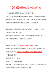 自由診療(自費診療)における一部治療費の価格改定